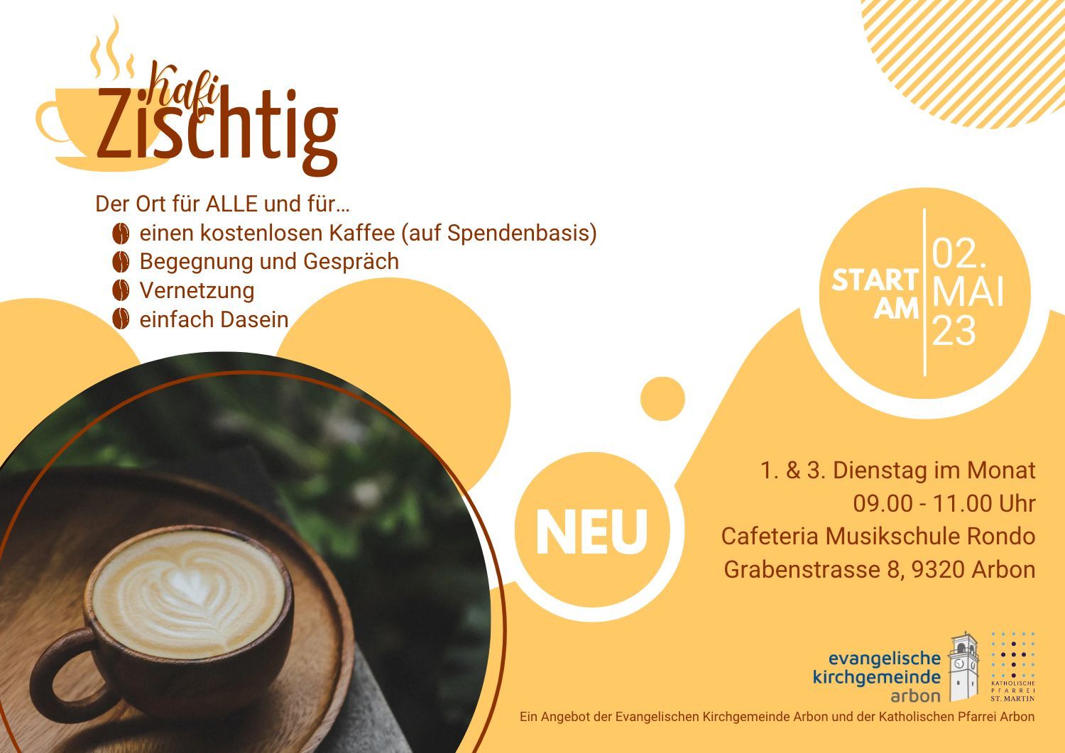 Kafi Zischtig ist ein Angebot der Evangelischen Kirchgemeinde Arbon und der Katholischen Pfarrei St. Martin Arbon.