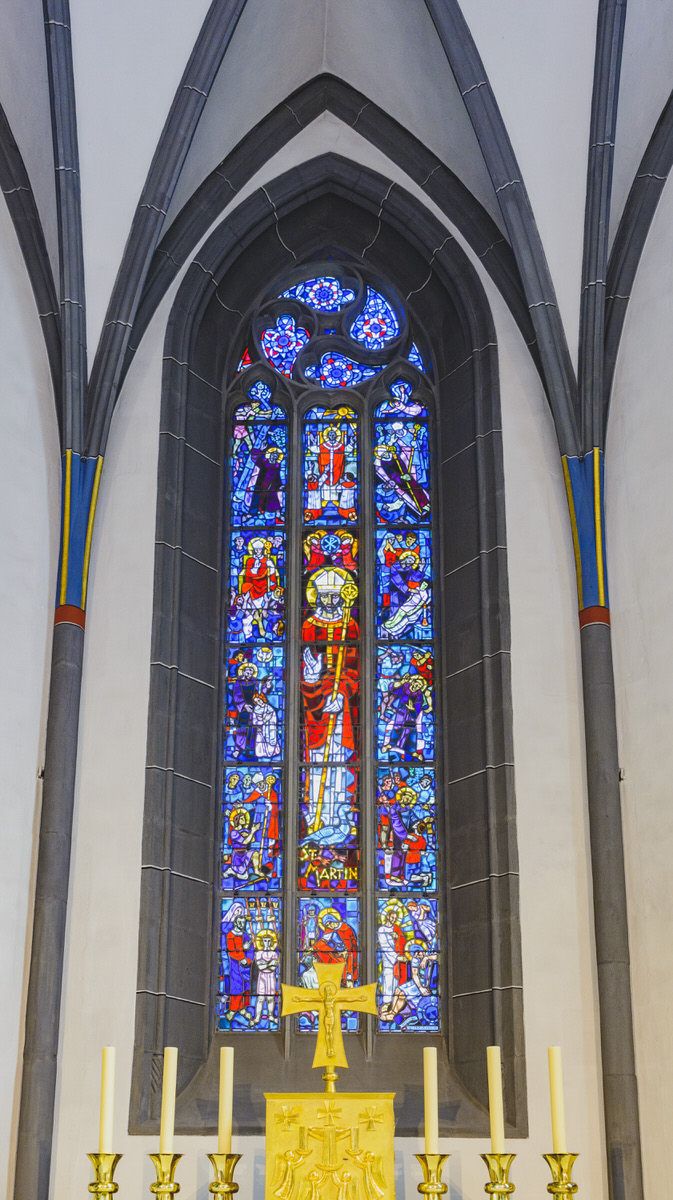 In der Mitte über dem Hochaltar findet sich der Kirchenpatron St. Martin. Ihn umgeben zwölf Szenen aus seiner Lebensgeschichte. Bekannt sind u.a. diejenige, in der er noch als römischer Hauptmann einem Bettler am Strassenrand den Mantel teilt.