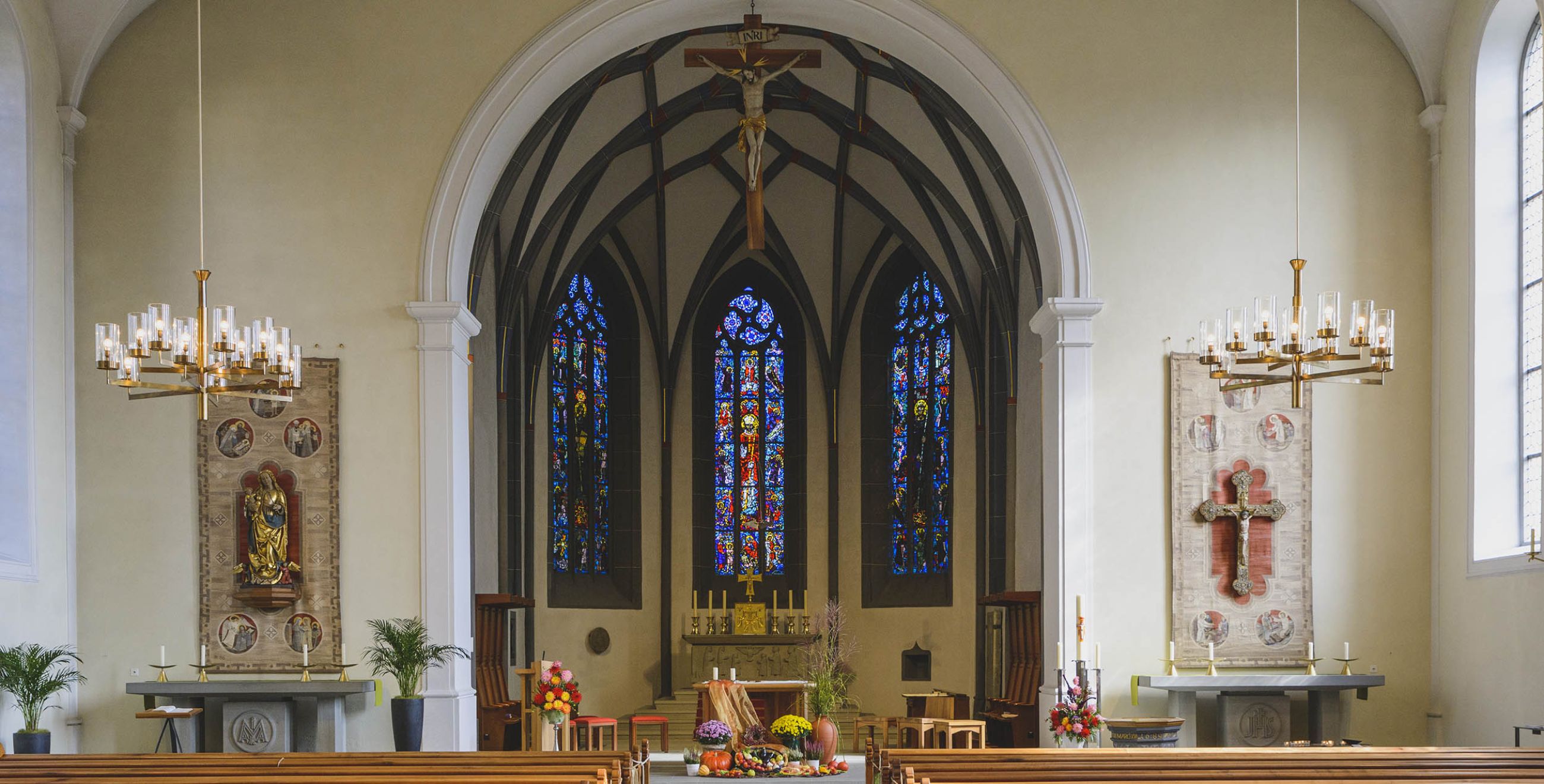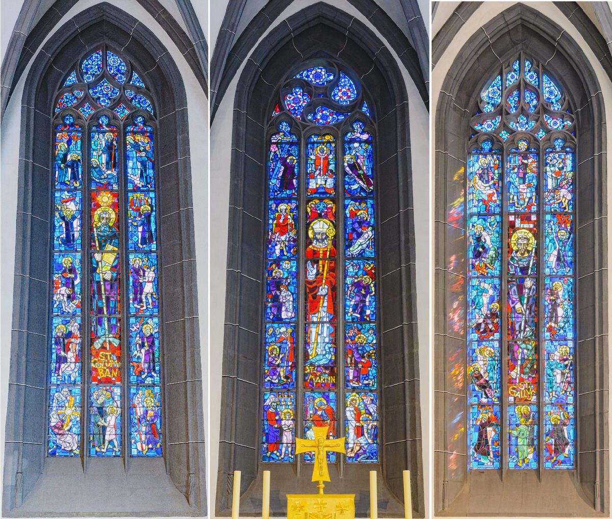 Besonders eindrucksvoll präsentieren sich die Buntglasfenster im Chor der Kirche. Entstanden sind sie 1952 durch Andreas Kübele nach einem Entwurf von August Wanner.