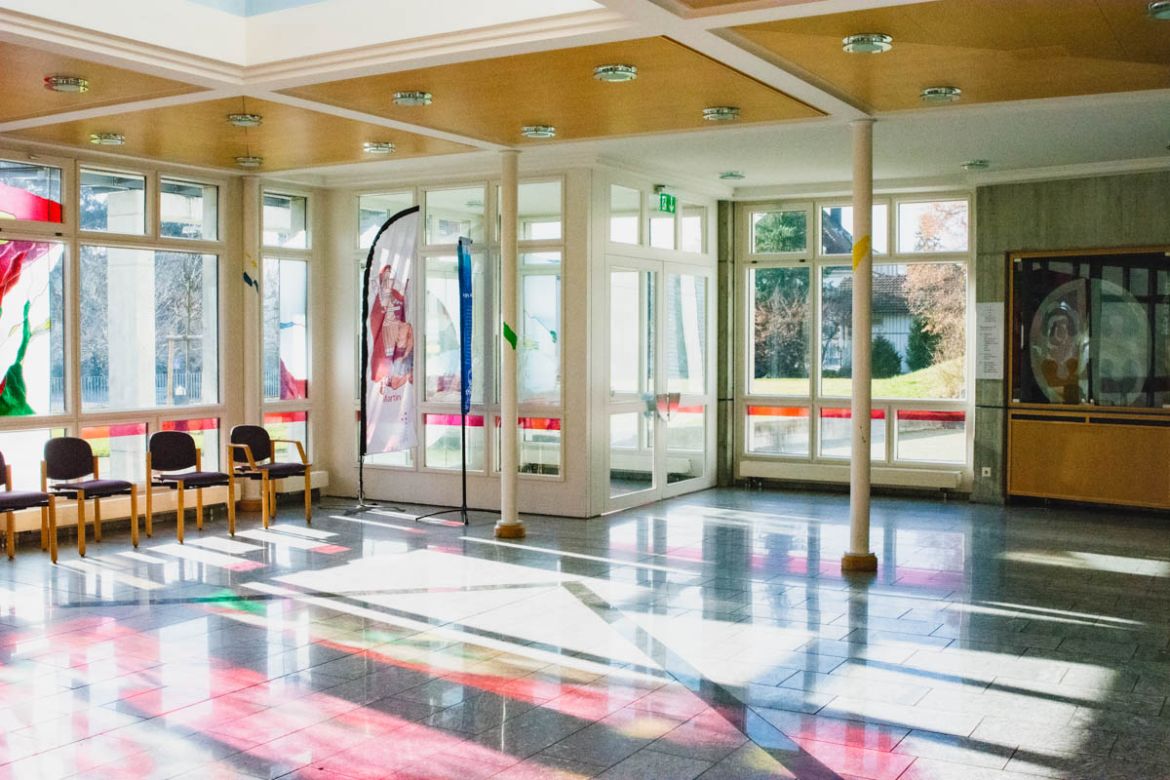 Unser Foyer ist mehr als nur ein Eingangsbereich. Er ist Begegnungsort, Apéro-Raum bei kleineren Anlässen, Garderobe und natürlich für viele oft der erste Blick hinein in unser Pfarreizentrum.