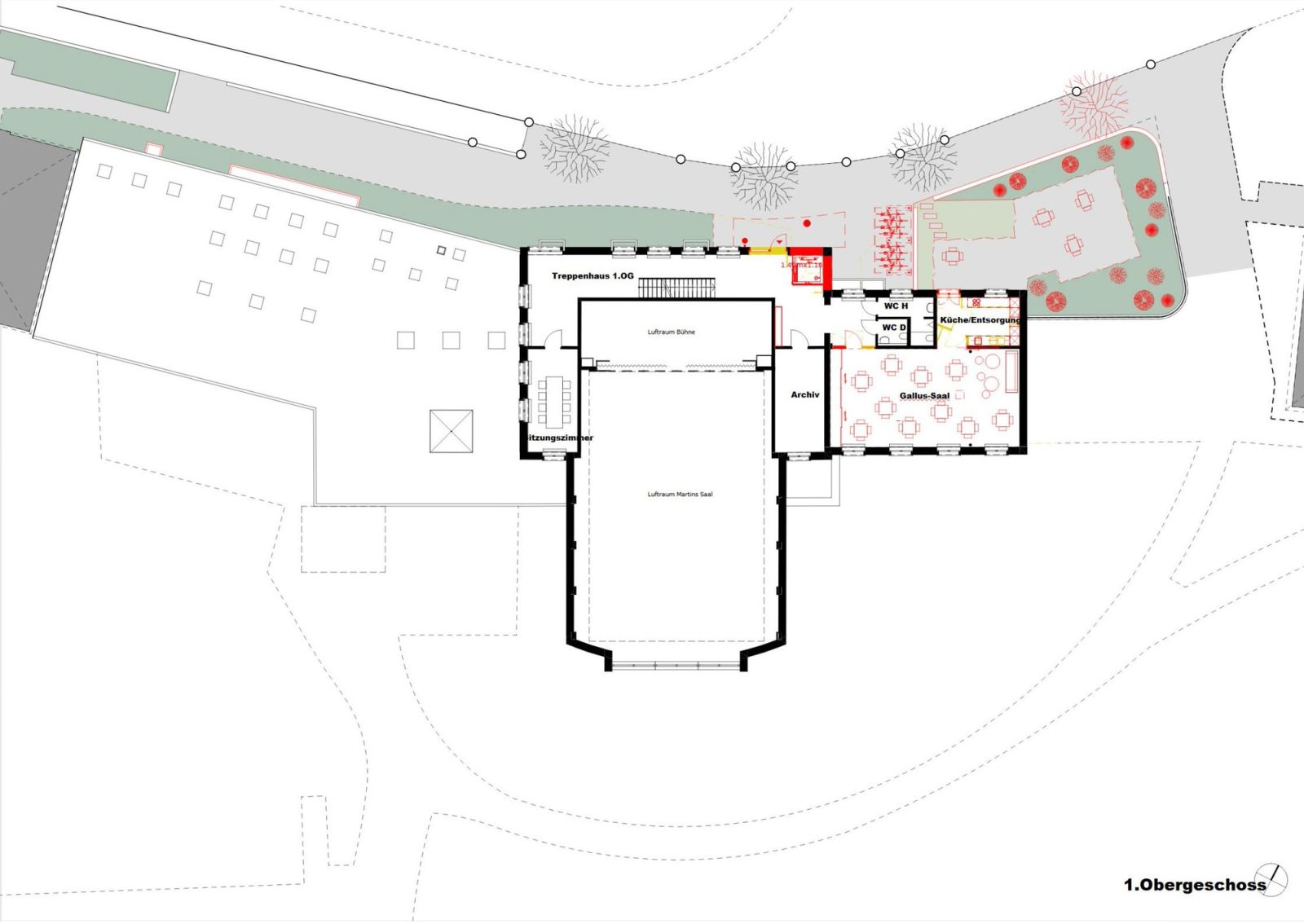 Um hierfür den nötigen Platz zu schaffen, wird der Bereich hinter der Bühne noch angepasst (Plan nicht aktuell)