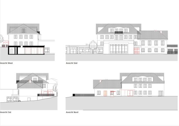 Im Zuge des Einbaus eines Aufzugs ergibt sich eine neue Eingangssituation. Die Türe wird sich fortan direkt zur Strasse hin öffnen und ein neues Vordach schützt vor dem Regen.